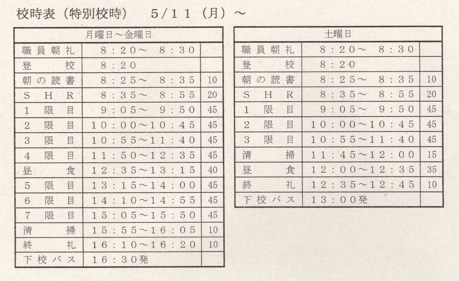 学校再開後の時間割 2020年5月9日 最終更新日時 : 2024年10月17日 hooh 5月11日(月)から学校が再開されます。 校時や時間割が通常とは異なりますので、確認してください。 ◆校時表◆ <5月12日(火)以降の校時・時間割> 月曜日時間割 火曜日時間割 水曜日時間割 木曜日時間割 金曜日時間割 ◆5月9日(土)までの時間割◆ 5月7日(木)時間割一覧 5月8日(金)時間割一覧 5月9日(土)時間割一覧 4月27日(月)時間割一覧 4月28日(火)時間割一覧 4月29日(水)時間割一覧 4月30日(木)時間割一覧