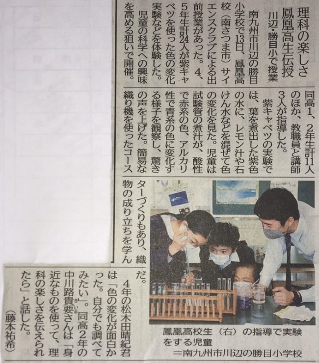 また、先日の勝目小学校での実験教室の様子を南日本新聞で掲載されました。