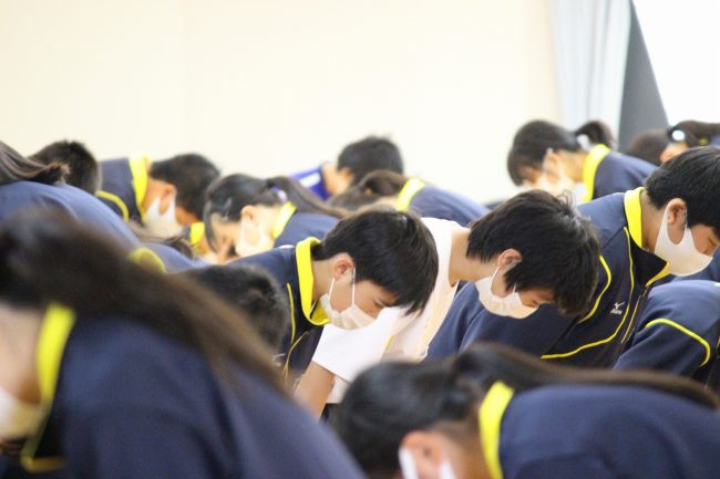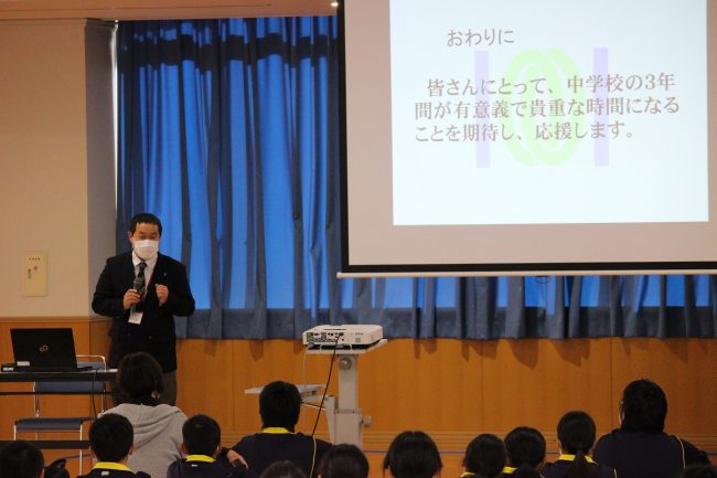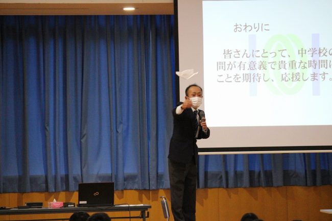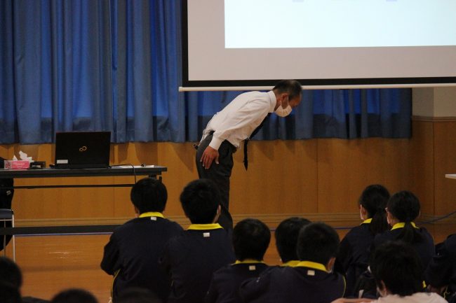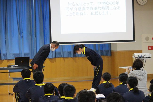 講師の松山徳和教諭から身だしなみやお辞儀の大切さなどを伝えられ、中学生は