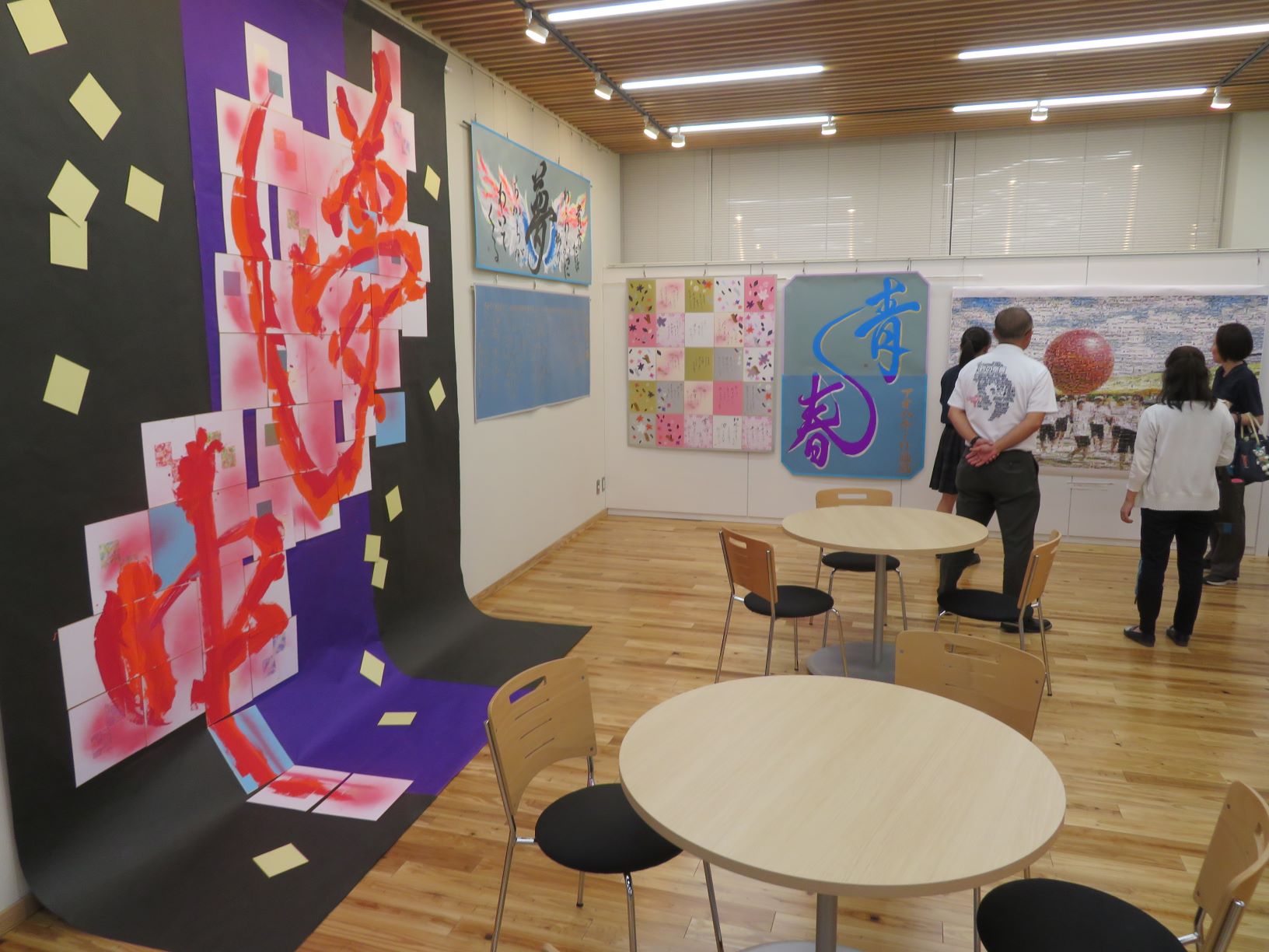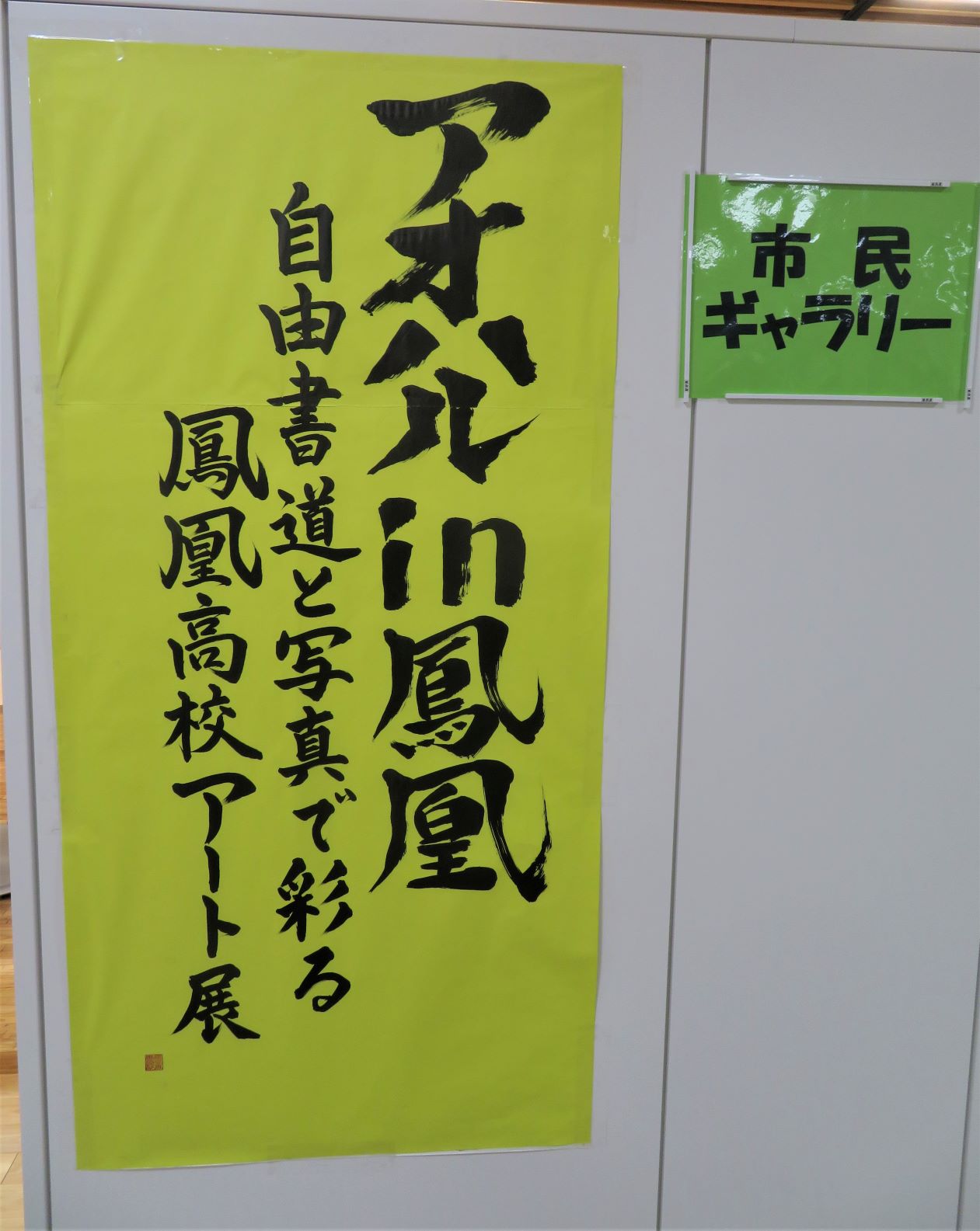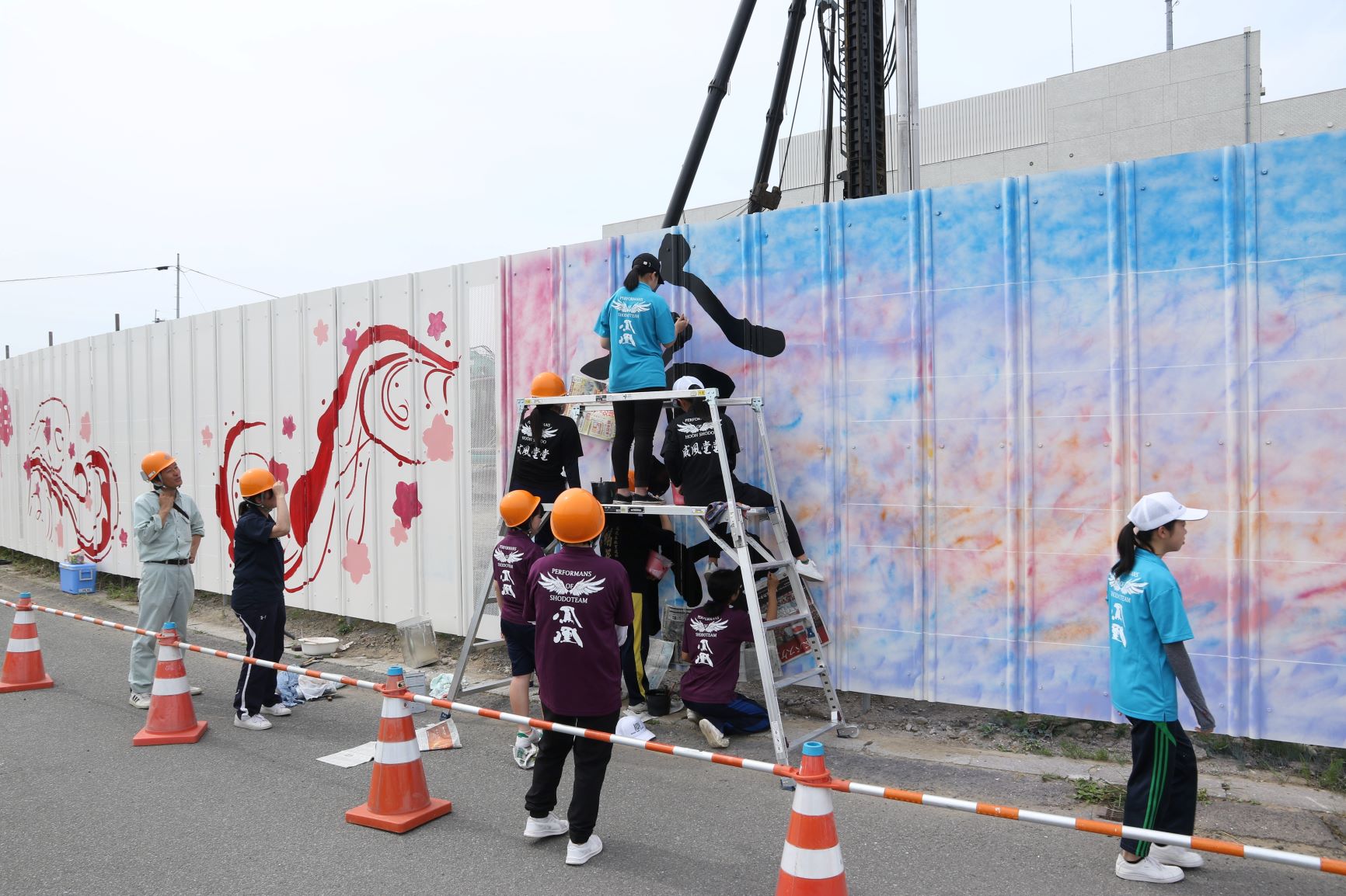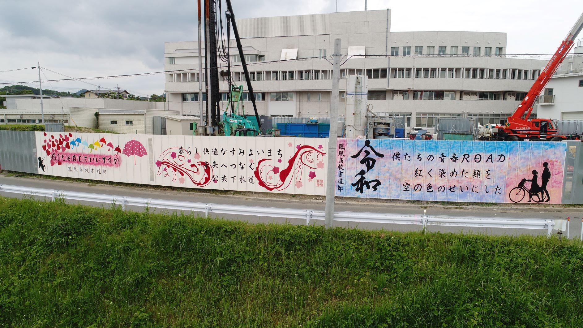 ▼5月に制作した南さつま市役所裏の工事現場安全防護壁への書画(現在も工事関係者、市民の皆様を楽しませています。)