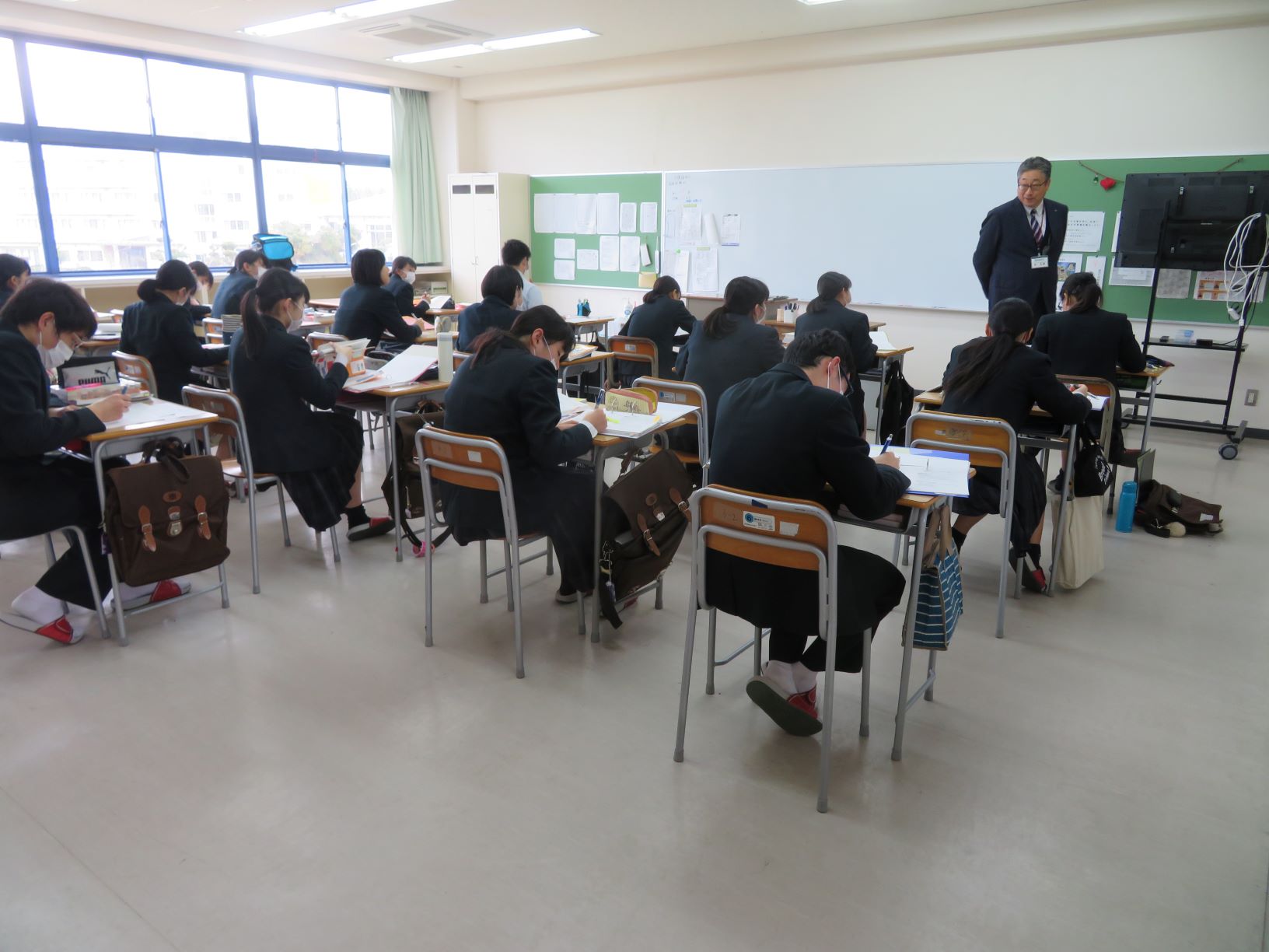 始業式後の2限目、各クラスではLHR(ロングホームルーム)の時間でした。今月26日、第32回介護福祉士国家試験を控える総合福祉科3年2組の生徒たちが試験対策をしていると西 美継校長先生がふらっと教室へ。机間巡視をしながら、1人1人に激励の声かけをしていました。