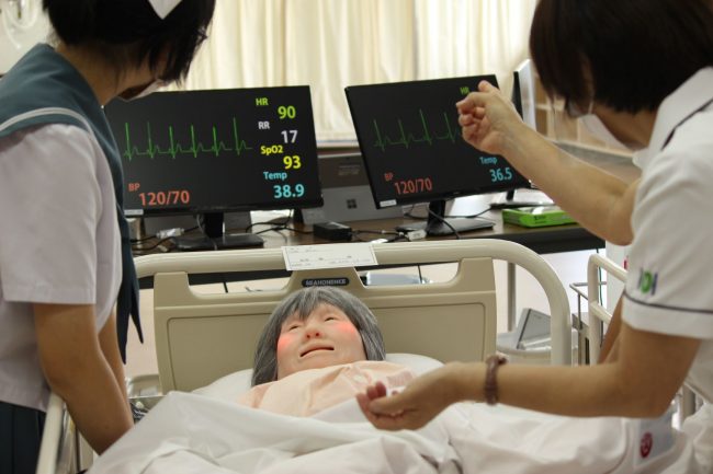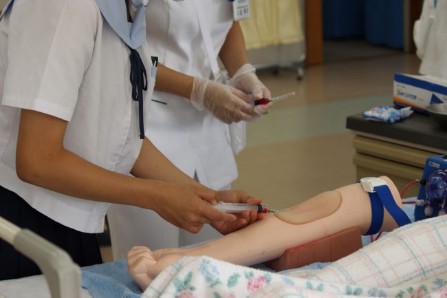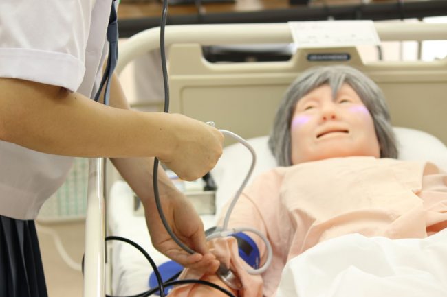 看護学科の棟では、注射の体験や校内演習で実際に使われる人体モデルを用いて聴診器や血圧測定を行いました。