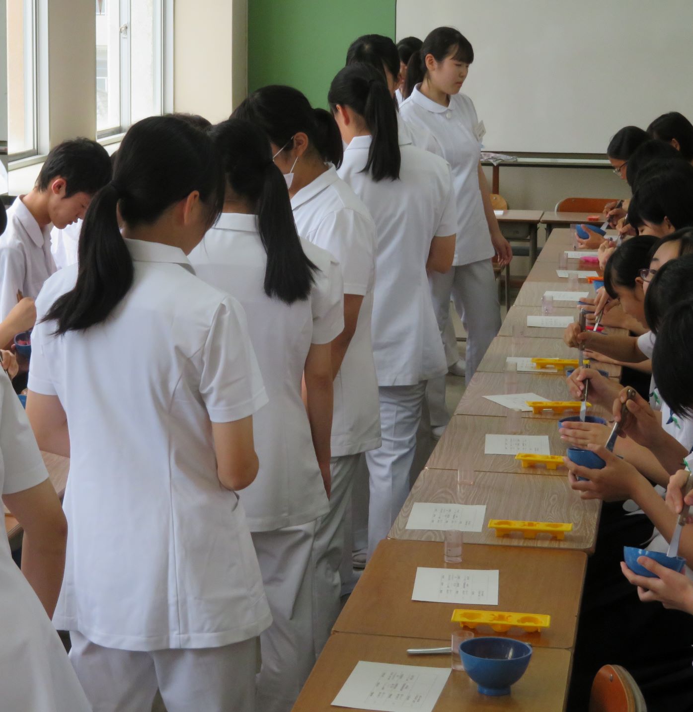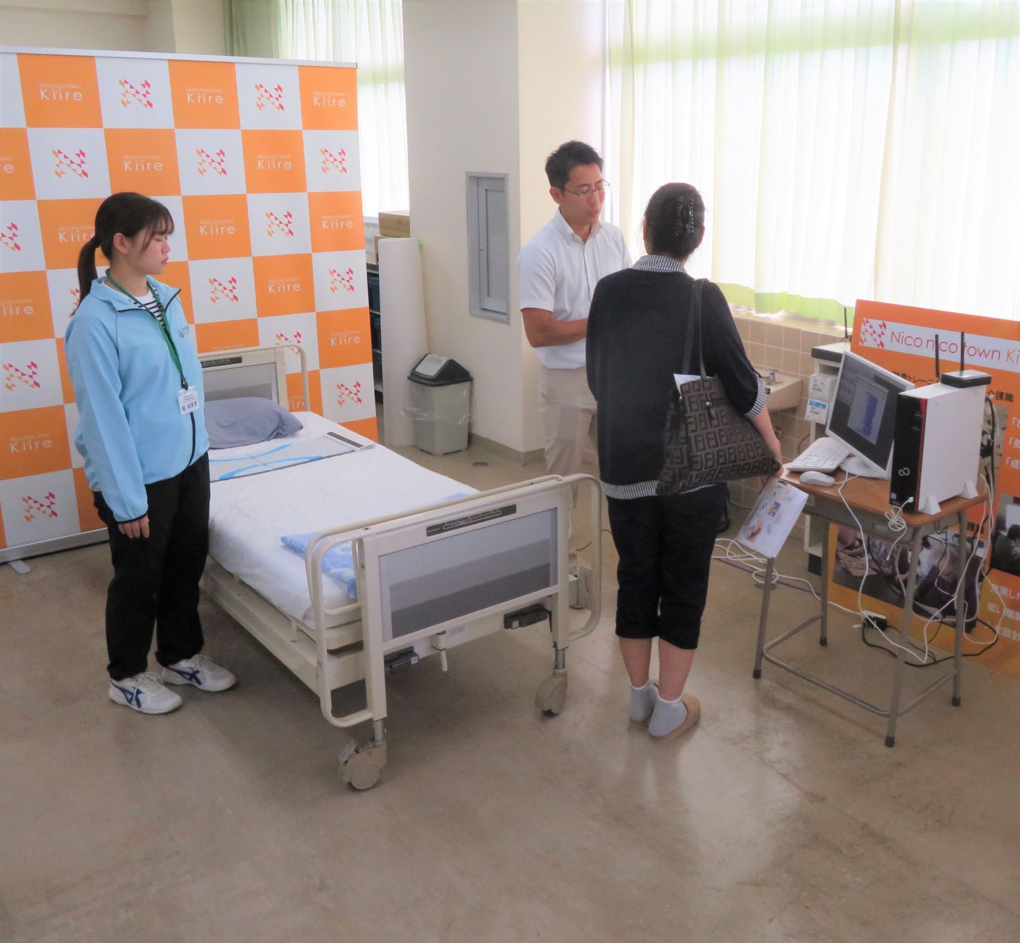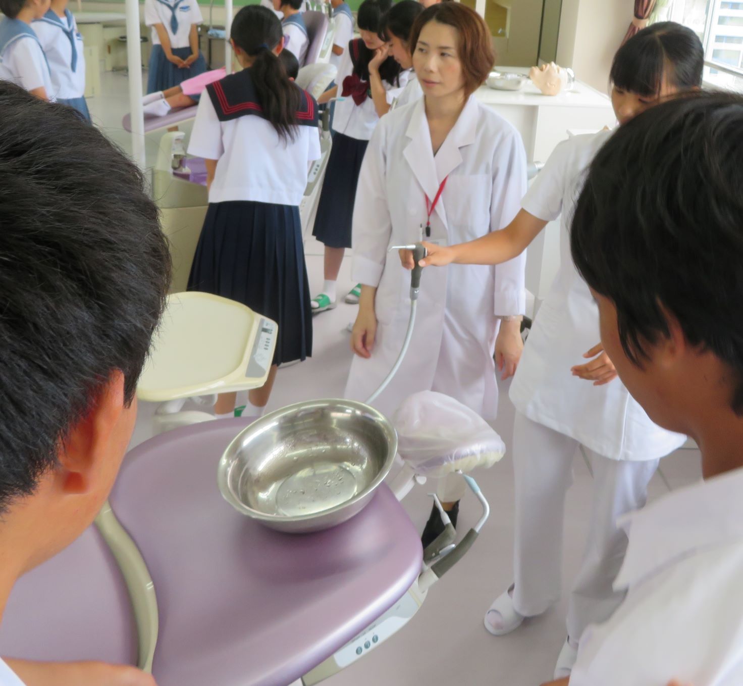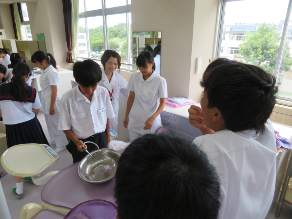 総合福祉科では、医療法人参天会の職員や鹿児島国際大学社会福祉学科の学生にもご協力いただきました。保護者の方々は、最新機器での身体測定などを体験したり、施設現場などで使用されている福祉機器を目の当たりにして驚いた様子でした。メディカルシステム科では、歯科実習体験を元気いっぱい 取り組んでいる様子が印象的でした。暑い中、本当にありがとうございました。