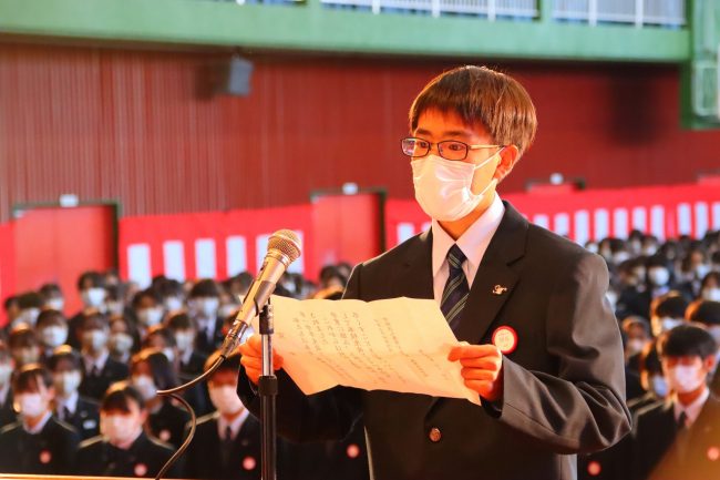 誠実とは何事にも真面目で真心がある。情操とは優れたことや尊いことに触れたり美しい物を見たときに感動する心のことです。また、豊かな心には芸術的な感性だけでなく、家族への愛情やお友達への思いやり、他人を尊敬する姿勢、良いことを行おうとする気持ちもあります。この2つの言葉は決して難しい言葉でも意味でもありません。新入生の皆さんには、この2つの言葉をしっかりと心に刻み学業と並行して心の成長、人間力の成長を期待します。この先楽しく有意義な出来事が待っていることでしょう。大いに自分を成長させて下さい。