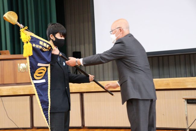 代表の生徒が学年旗(青)を校長先生から受け取りました。
