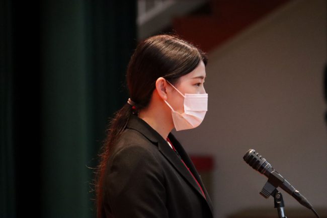 1年生は是非、自主的に行動して下さい。私は入学当初、言いたいことを言えず、やりたいことも挑戦しませんでした。今となっては少し後悔しています。だから、皆さんは将来自分が後悔しないように、考えて自主的に行動をしてください。