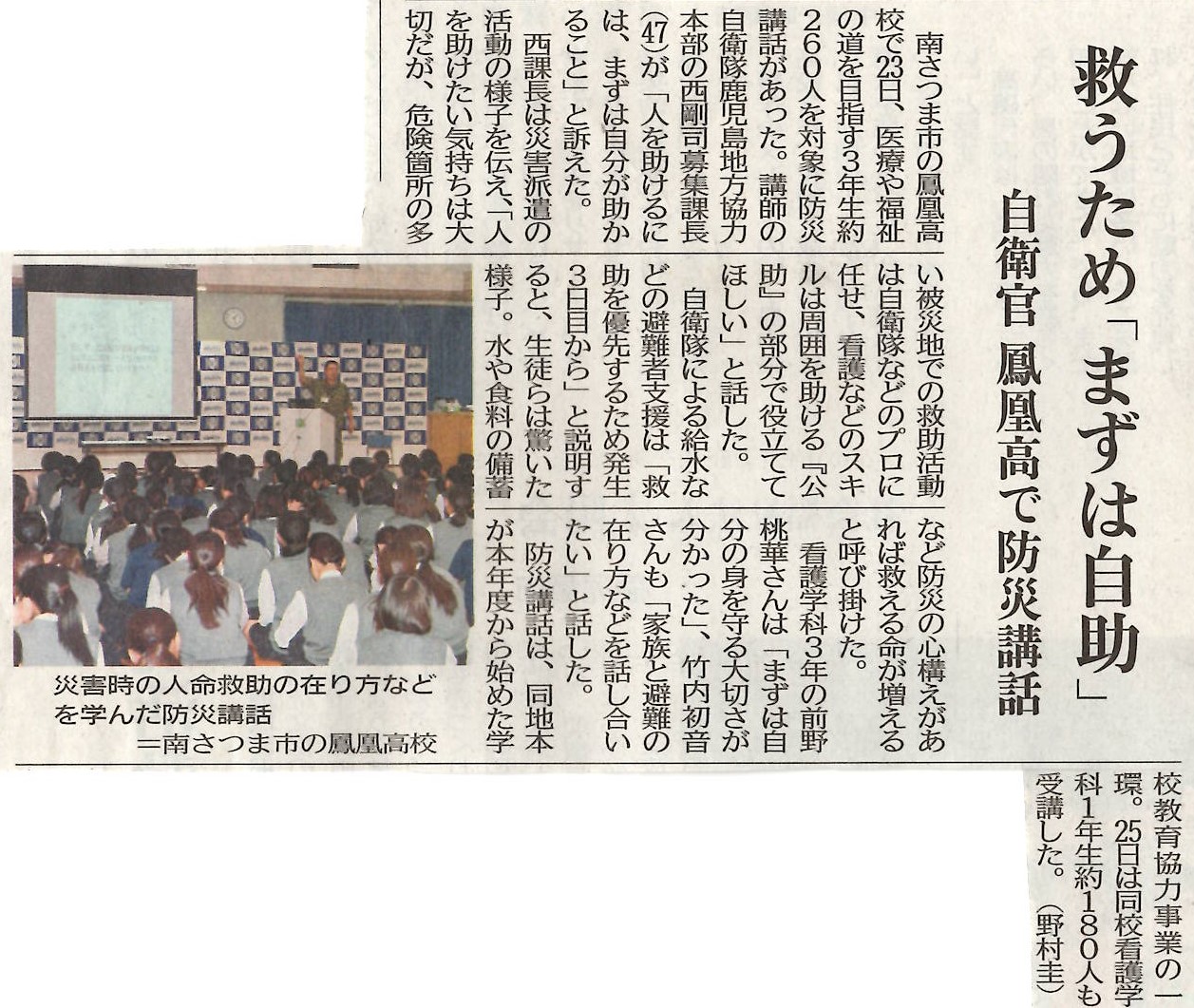 本日の南日本新聞には、先週10/23、25の両日、高校3年生、1年生対象に行われた自衛隊による防災講話が紹介されました。