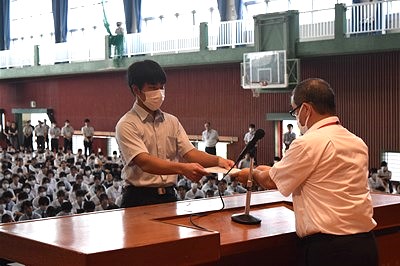 本日(9月2日)は体育館で全校朝礼があり、検定合格の表彰式が行われました。