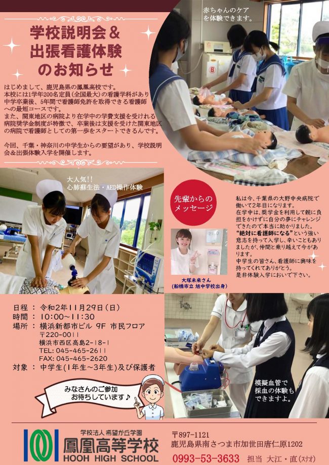 新型コロナウィルスの影響で鹿児島まで見学にくることができない関東地区の希望者から要望もあり、今年度最後の『出張看護体験&学校説明会』を明日、神奈川県横浜市で実施いたします。