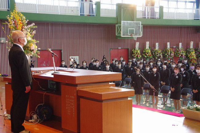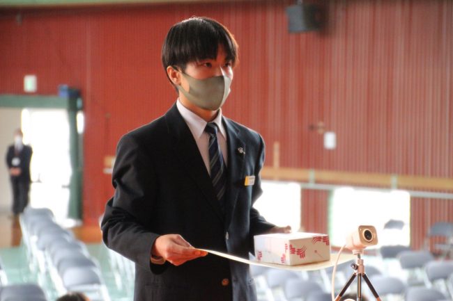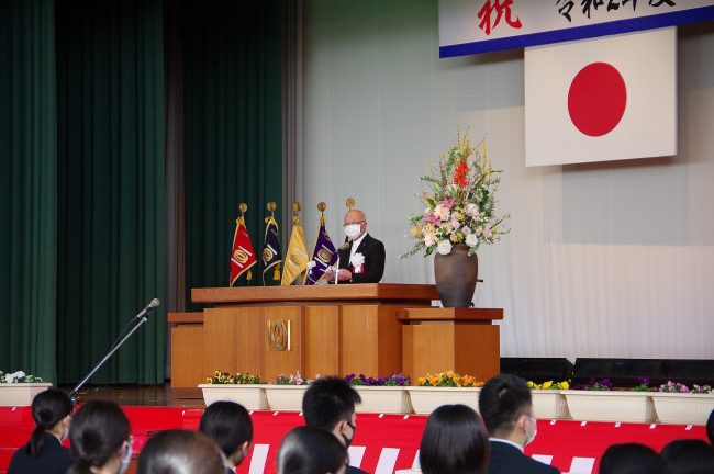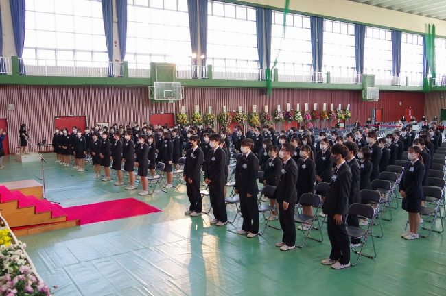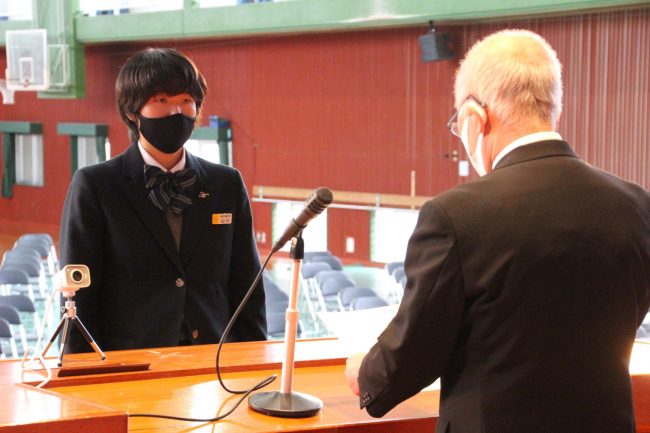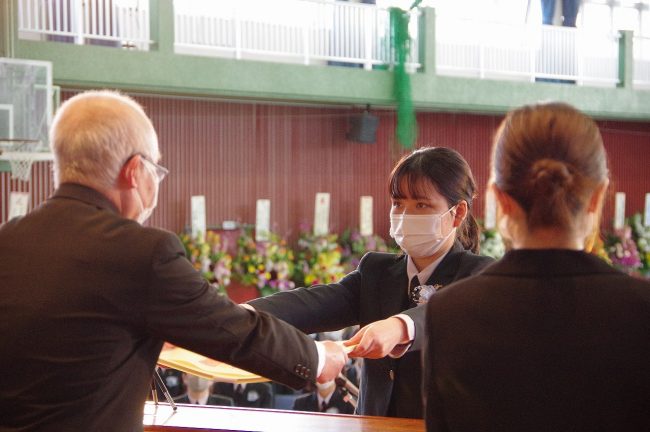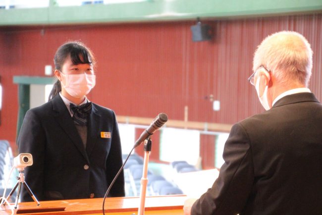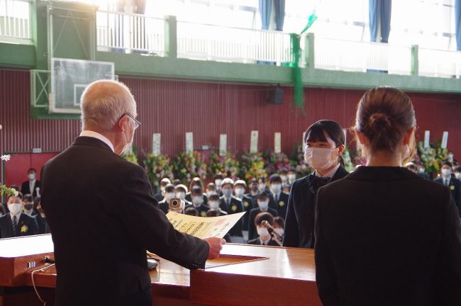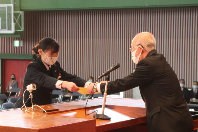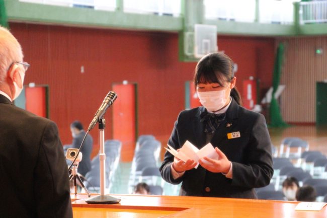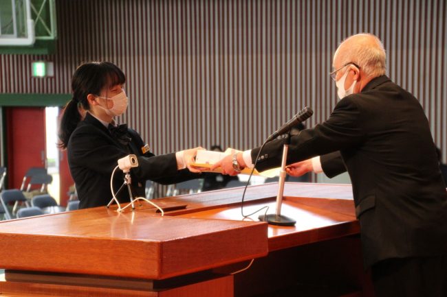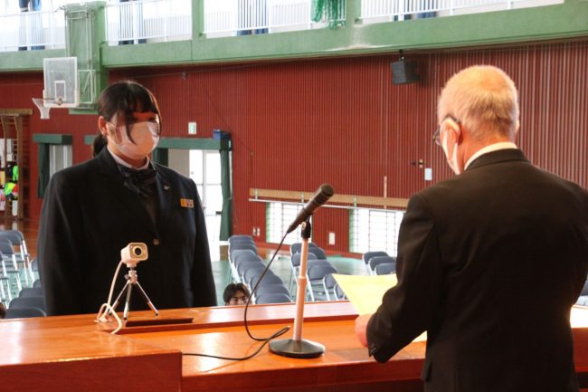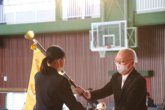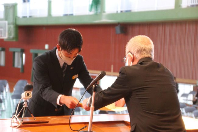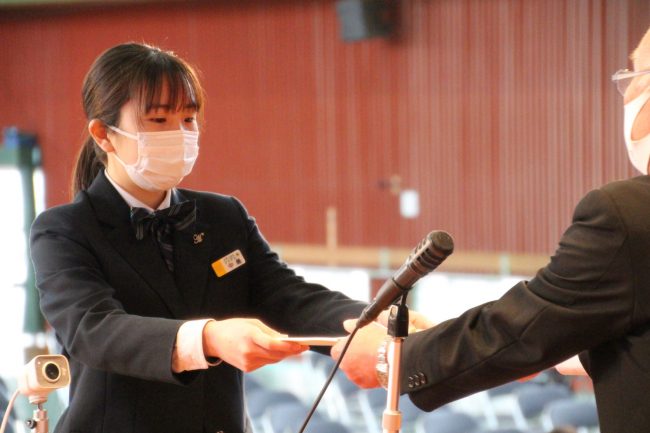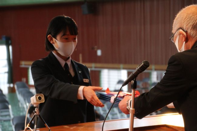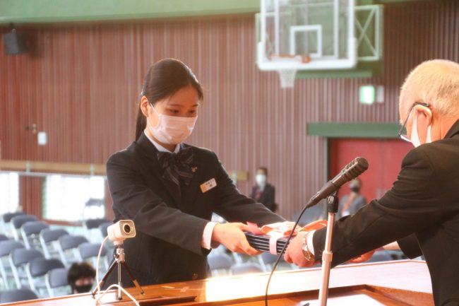 表彰式終了後には、各種資格取得者の資格証授与、卒業祝い品授与、卒業記念品贈呈、学年旗返還がそれぞれ行われました。