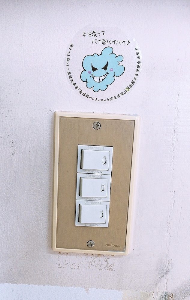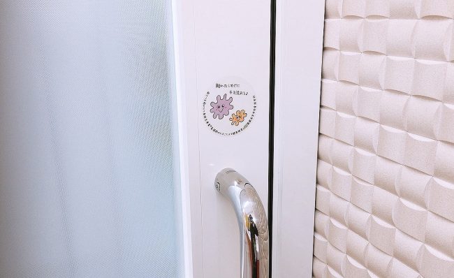 「バイバイ菌シール」は、人がよく触るところに設置して、シールのある場所に触れたら手を洗おう!というメッセージになっています。