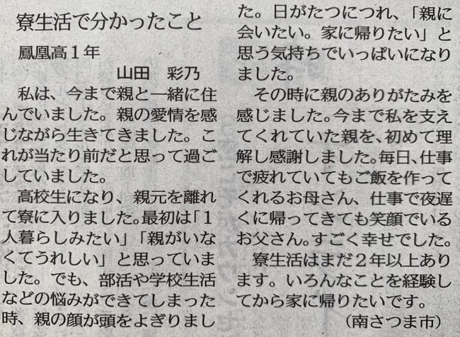 1つ目は、9月21日に掲載された1年生 山田綾乃さんの「寮生活で分かったこと」。