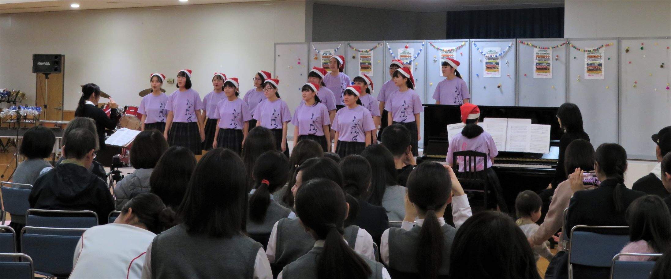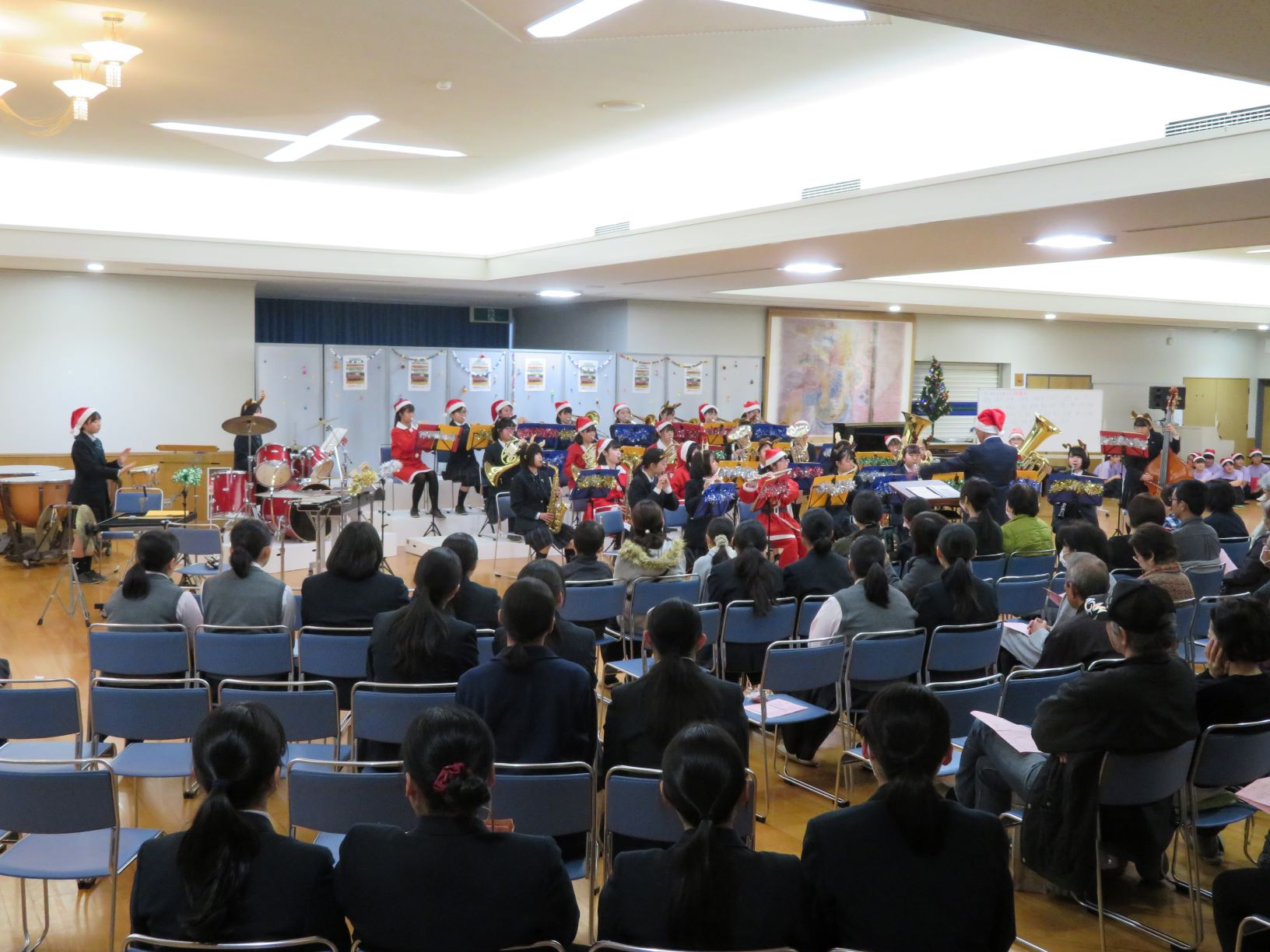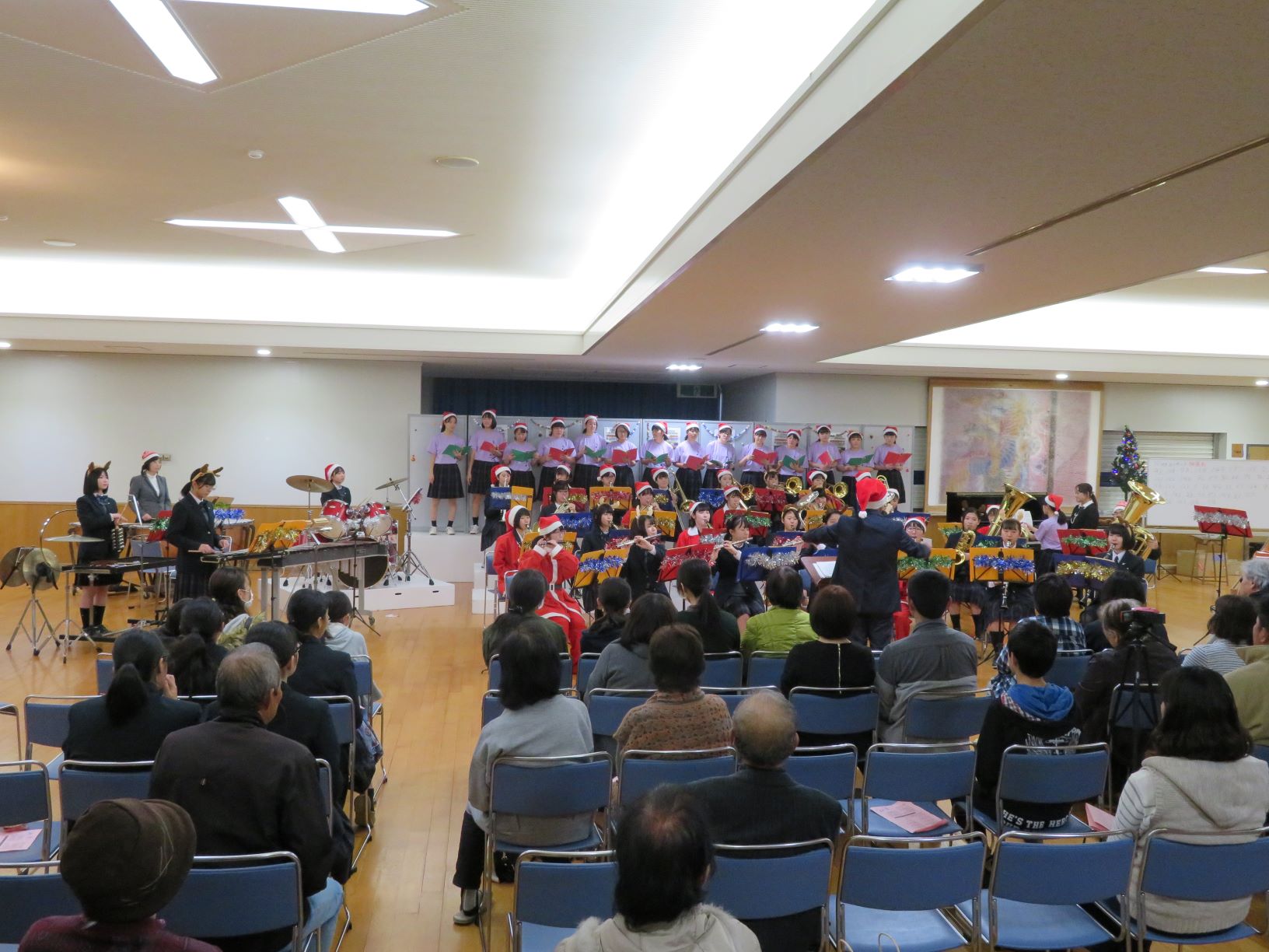 コンサートは12/15(日)14時から本校武道館で開催されました。会場は保護者の方々、家族、友人などで満席になり、全員にプレゼント配布、さらにお楽しみ抽選会もあり大盛況のうちに閉幕しました。ご来場いただいた方々には感謝申し上げます。