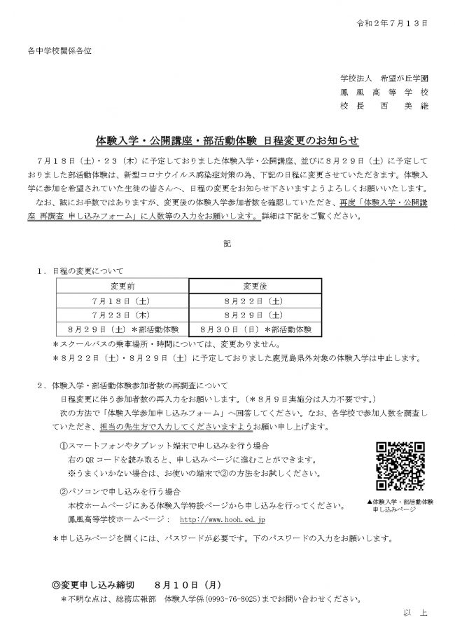 体験入学の日程変更などで、皆さまにおかれましてはご迷惑をおかけしております。