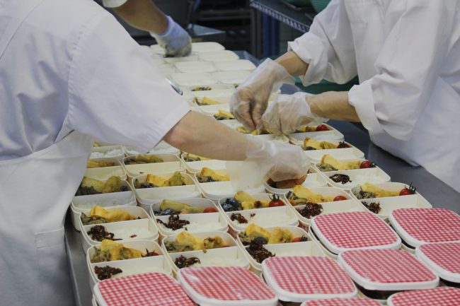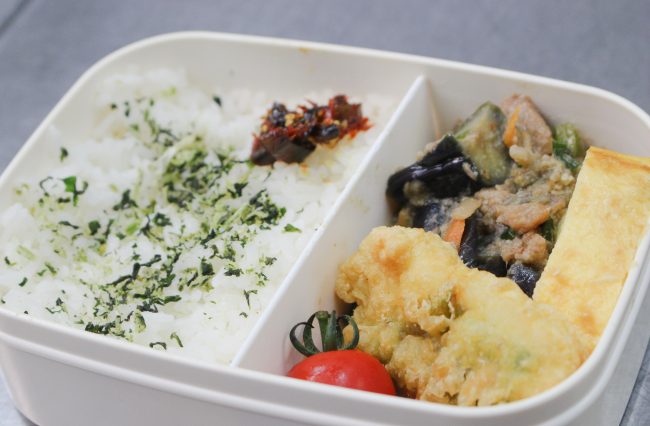 昨日の昼食(弁当)は「菜めし・鶏の天プラ梅しそ・ナスとツナのピリ辛味噌炒め・玉子焼き・ミニトマト・佃煮」でした。 写真はその昼食(弁当)を準備している給食センターの様子です。