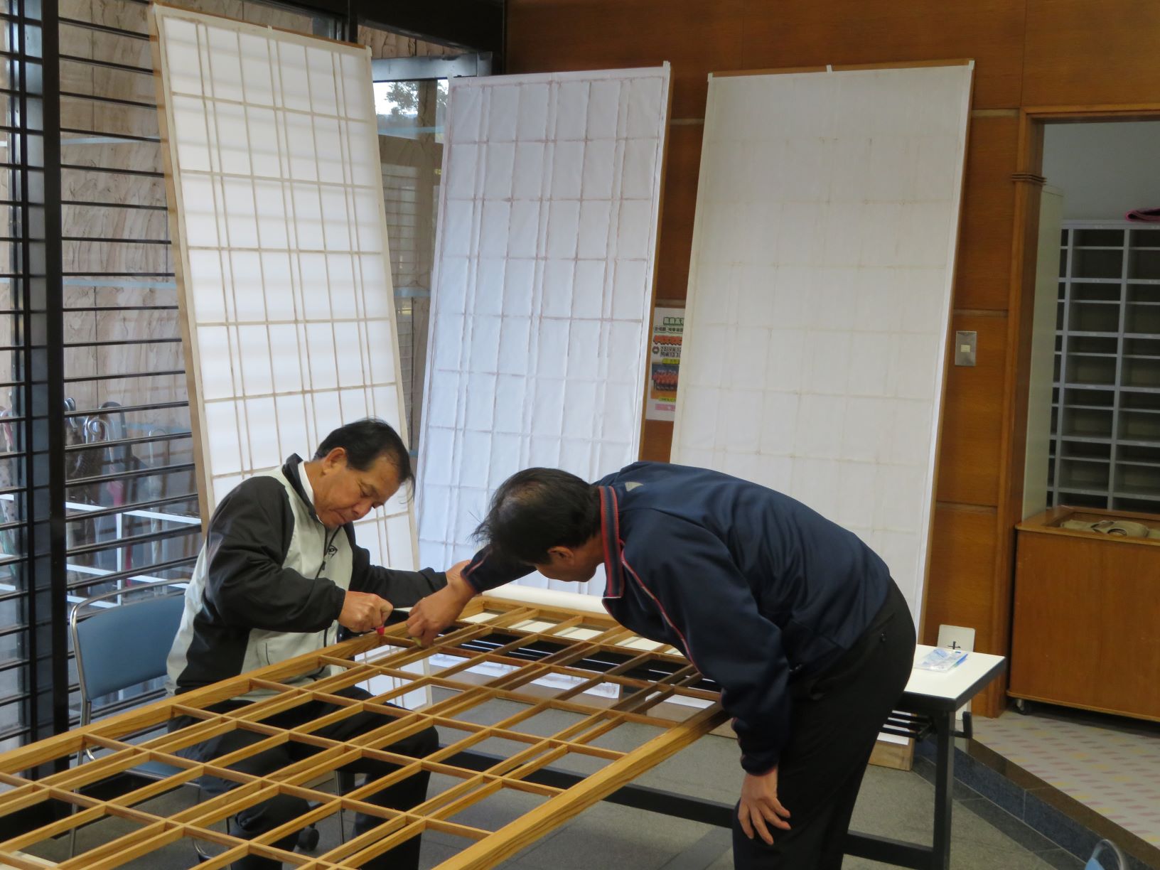 寒い中4枚の障子をせっせと張り替えている先生方…感謝!