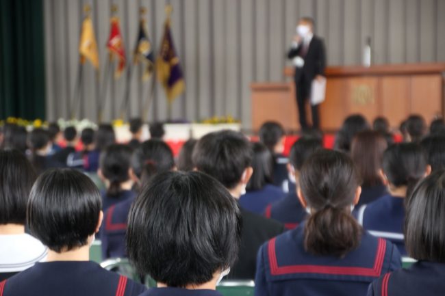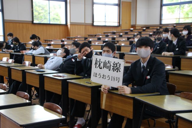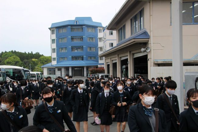 担当教員からバスでのマナーやコロナ対策などについて話があり、真剣な眼差しで注意事項を聞いていました。