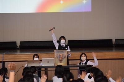 南さつま飛びたて高校生事業で活躍している専門課程1年生3名による講話もあり、「LGBTQ]「SOGI]について、質問も交えながら分かりやすく後輩達に話をしてくれました。