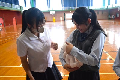 講話終了後、実際の命の重みに触れようと赤ちゃんの人形を抱っこする生徒も見受けられました。