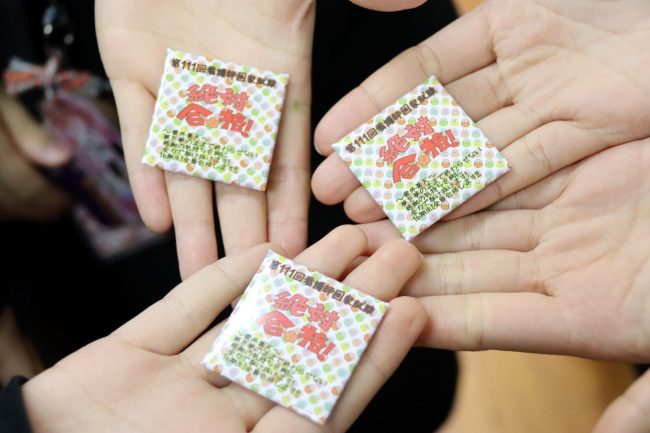 また、恵方巻と同時に先生方からお菓子と願いのこもった缶バッチの差し入れもありました。