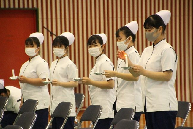 本日は、看護学科基礎課程19期生が戴帽式予行を行いました。