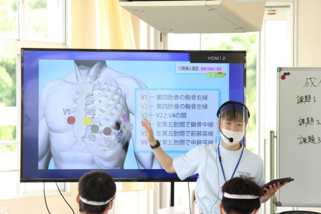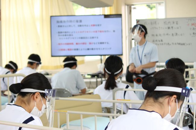 授業は「成人看護Ⅰ」で狭心症について看護実習室にて行われました。