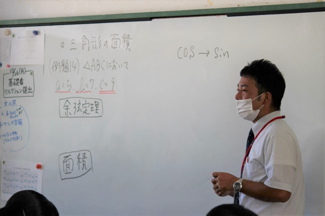 三角比を利用した三角形の面積を導入し、3辺の長さのみがわかっている場合の面積の求め方について、定理・公式を確認しながら解き進めていきました。