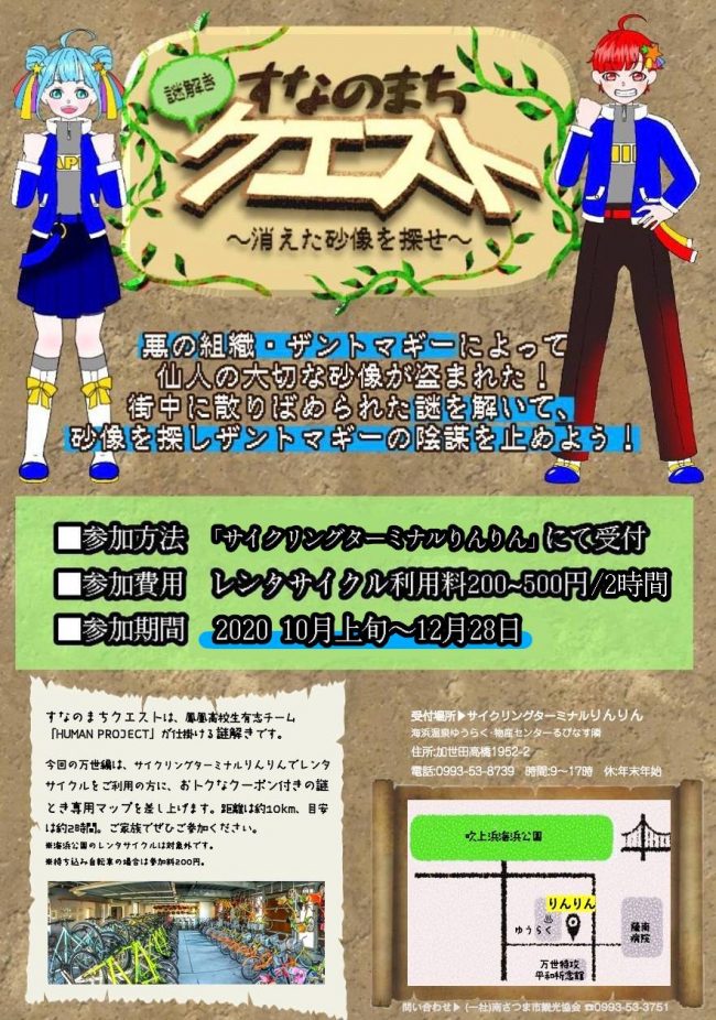 南さつま市の「砂像」・「サイクリング」と本校の「謎解き」を組み合わせた周遊型イベントとなっております。