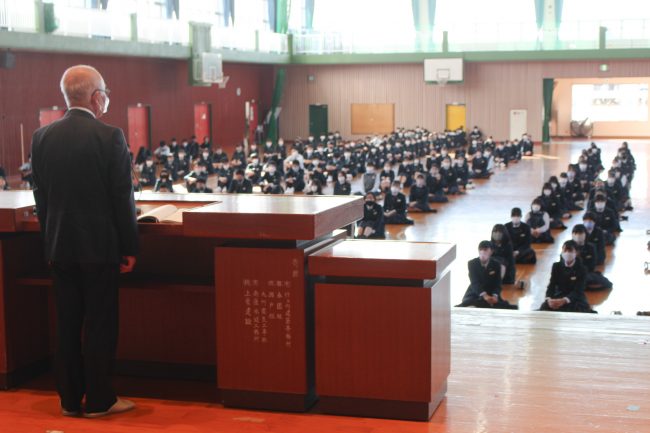 本日の就任挨拶では「青春をとめるな!!」と、生徒たちのこれまでの頑張りを称え、さらに前に突き進もうという力強いメッセージをおくり、生徒たちは真剣な眼差しで校長先生を見つめていました。