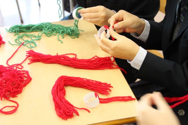 総合福祉科のクリスマスツリーに飾られている毛糸帽子のオーナメントを作成する様子です。