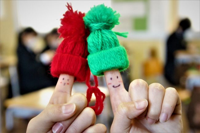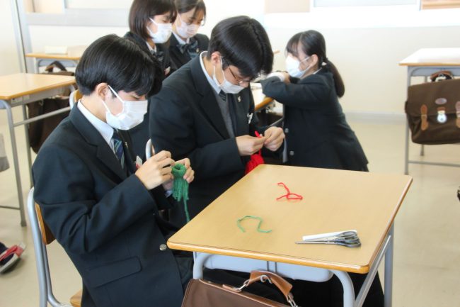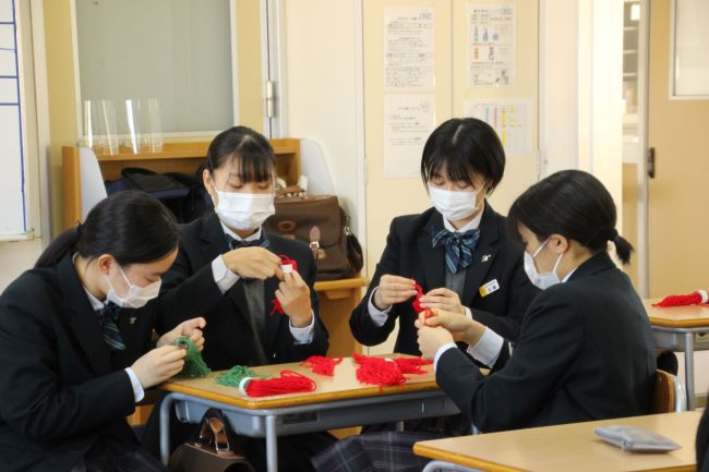 冬らしくてかわいい飾りなので、生徒達はカバンに付けたり、ペットボトルのキャップにかぶせたりしていました。