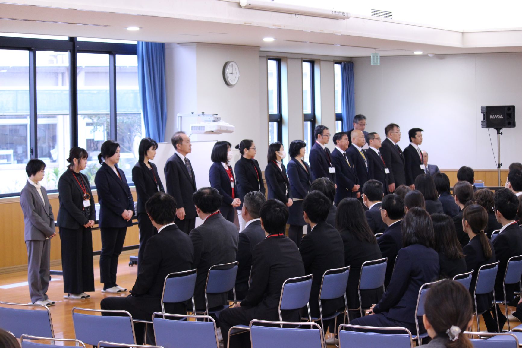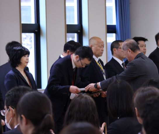 本日、武道館で本学園職員の永年勤続表彰が行われました。学園のために長年尽力され30年勤続表彰を受けた先生は、代表挨拶で「勤務年数の長短は違えど学園発展を思う気持ちは変わらず勤めて参りました。学校の移り変わりも思い出しているところですが、この感謝状を機にさらに頑張る気持ちでいっぱいです。」と感謝の言葉を述べられました。
