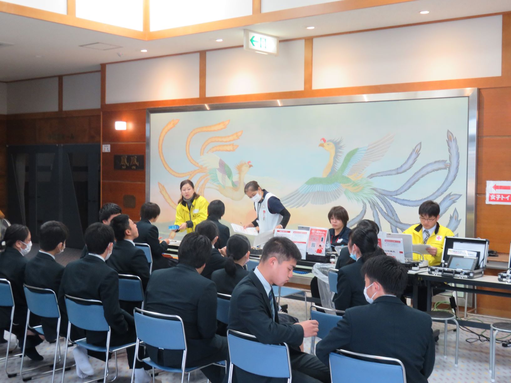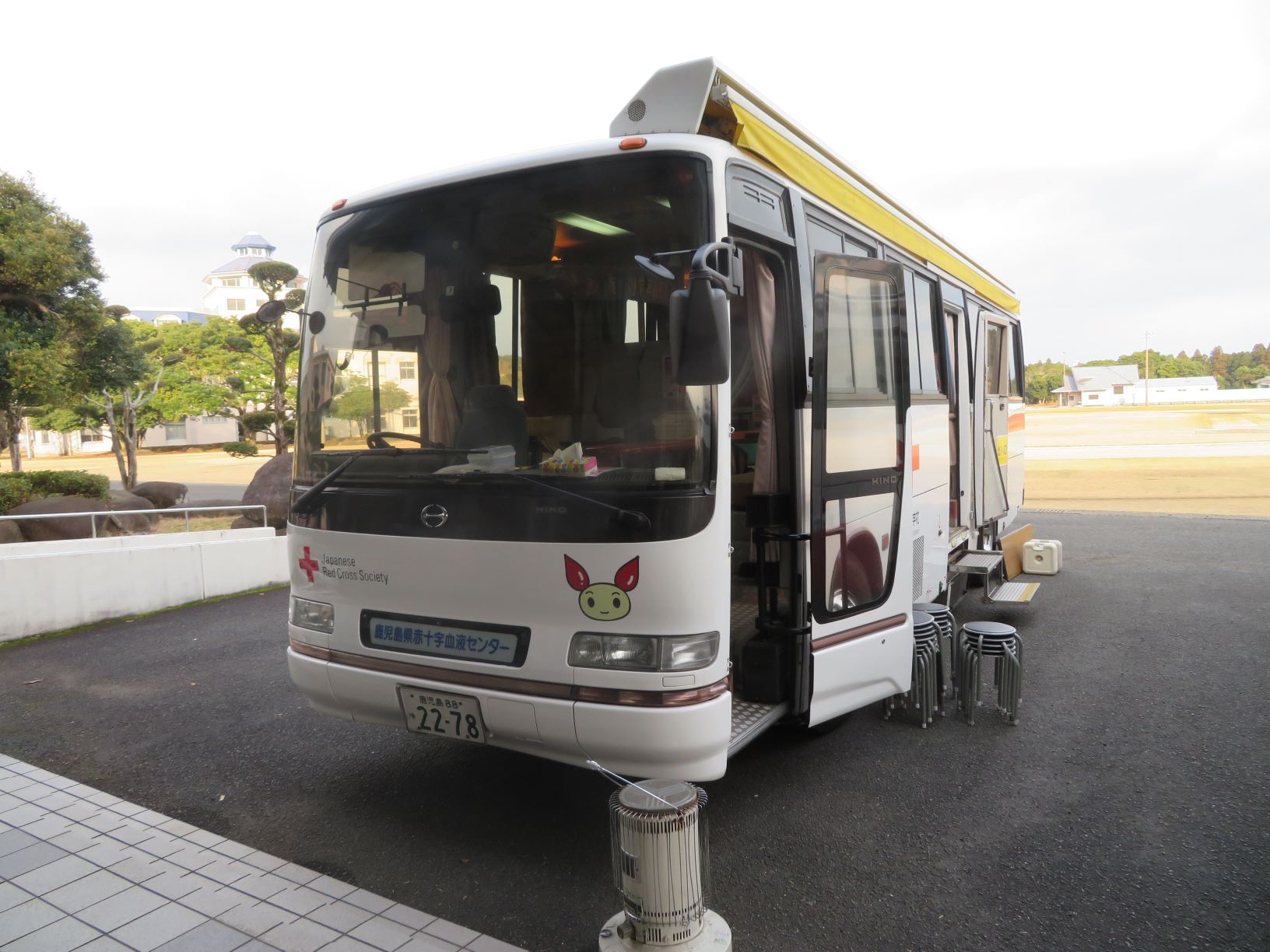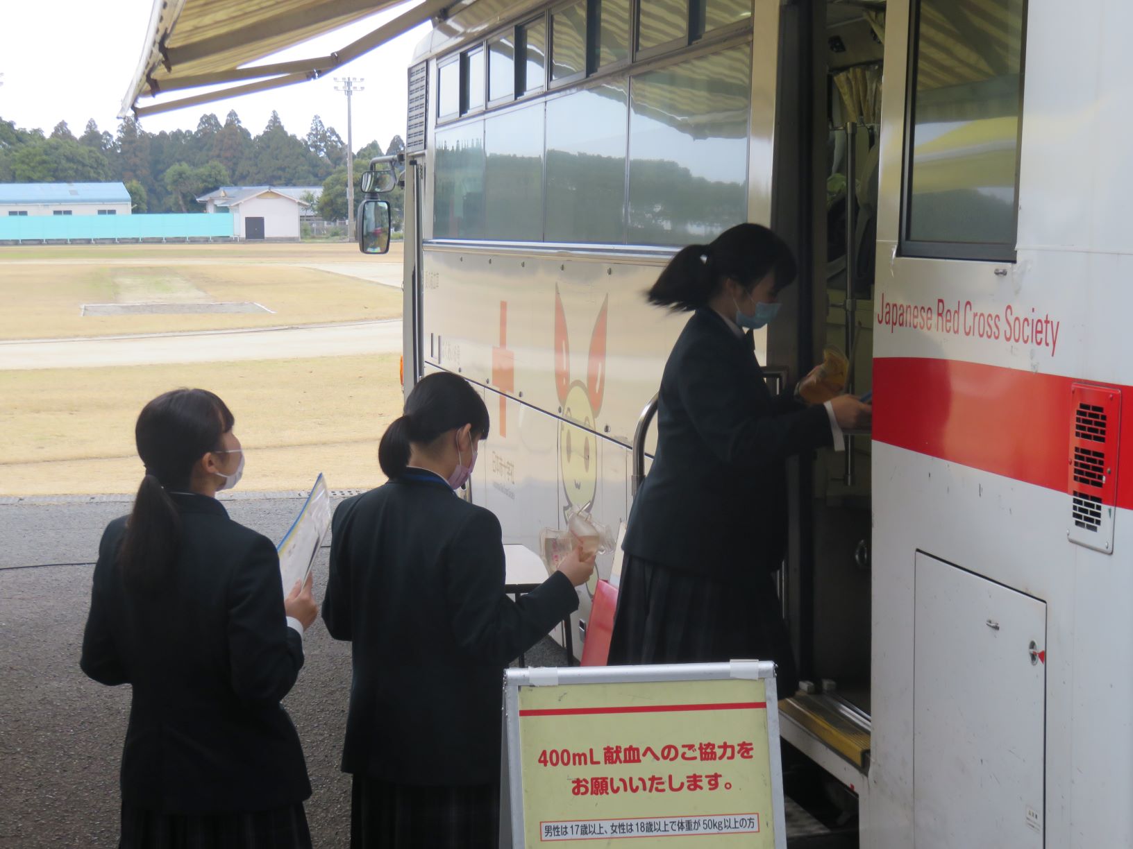 本日、日本赤十字社鹿児島県赤十字血液センターから2台の献血バスが本校武道館前に来ました。年齢や体調面の条件をクリアした多くの生徒が献血の協力をしました。