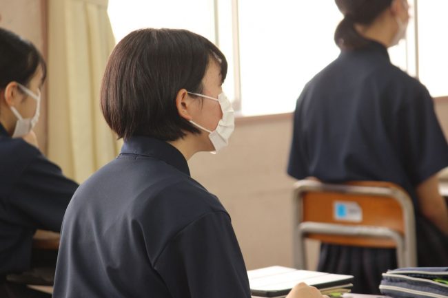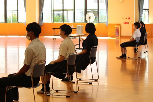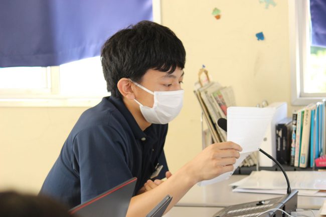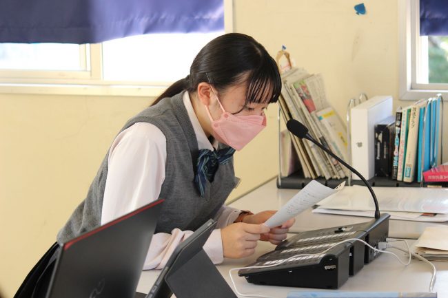 新型コロナ感染症対策として、演説は放送にて行われ、生徒の皆さんはクラスで自己紹介スライドを見ながら演説に耳を傾けていました。