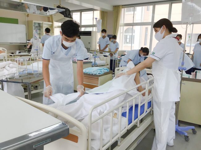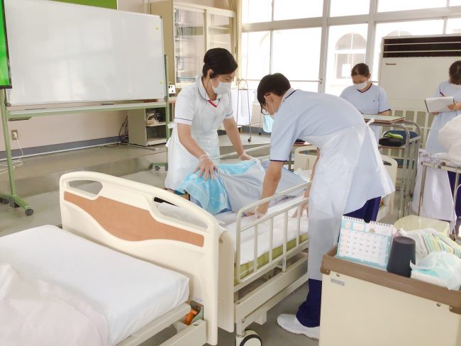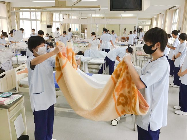 本日は看護学科基礎課程1年生の男子が慣れない手つきでシーツ交換をしている様子をお届けします。