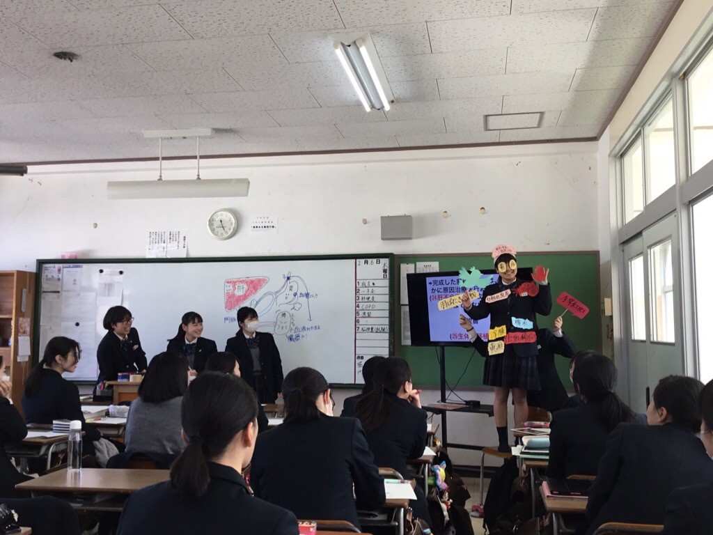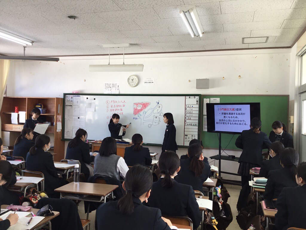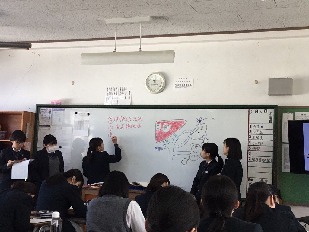 本日、看護学科基礎課程3年6組では協同学習を行っていました。「肝硬変」を勉強したグループは、その勉強した内容をクラスメイトに発表しました。先生が授業するのではなく、生徒同士で学ぶスタイルで学習をすすめています。