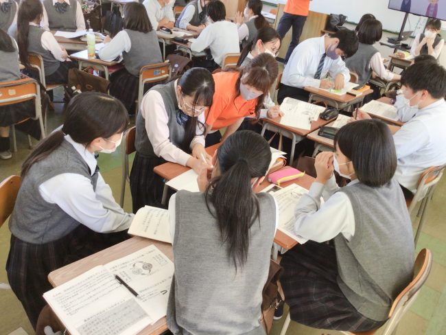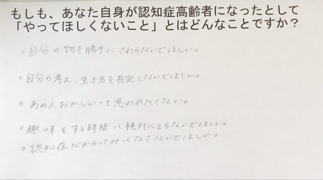 生徒たちは、認知症になった方やそのご家族の気持ちを考えました。