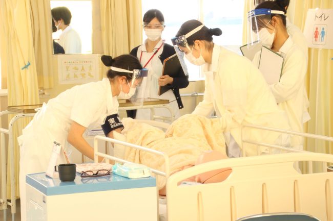 演習中は生徒は教員を「先生」と呼ばず、「看護師さん」と呼びます。また、実習室入り口にはナースステーションを模したブースがあり、立ち入る際は「失礼します」と言ってから入ります。