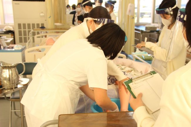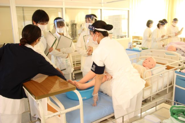 本日はモデル人形を用いて、足浴の演習を行っておりました。