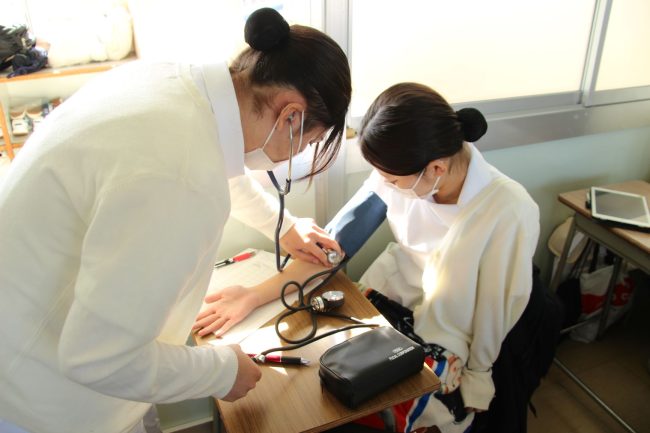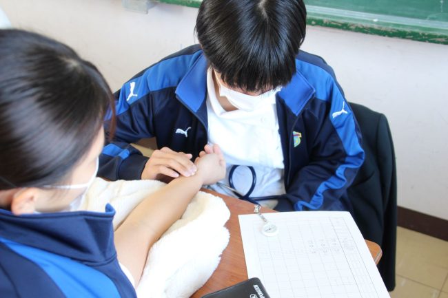 半分が実習室で演習をし、残りのグループはクラスで血圧測定や脈拍測定の練習をしています。