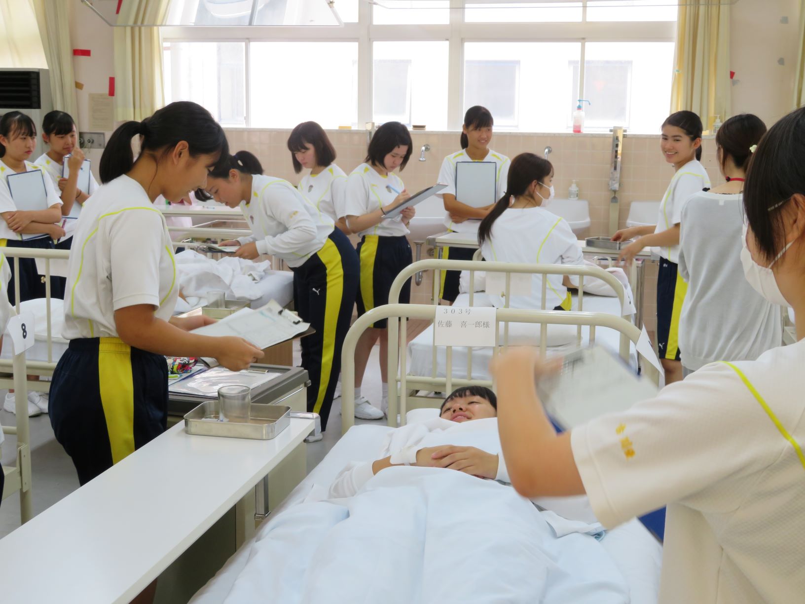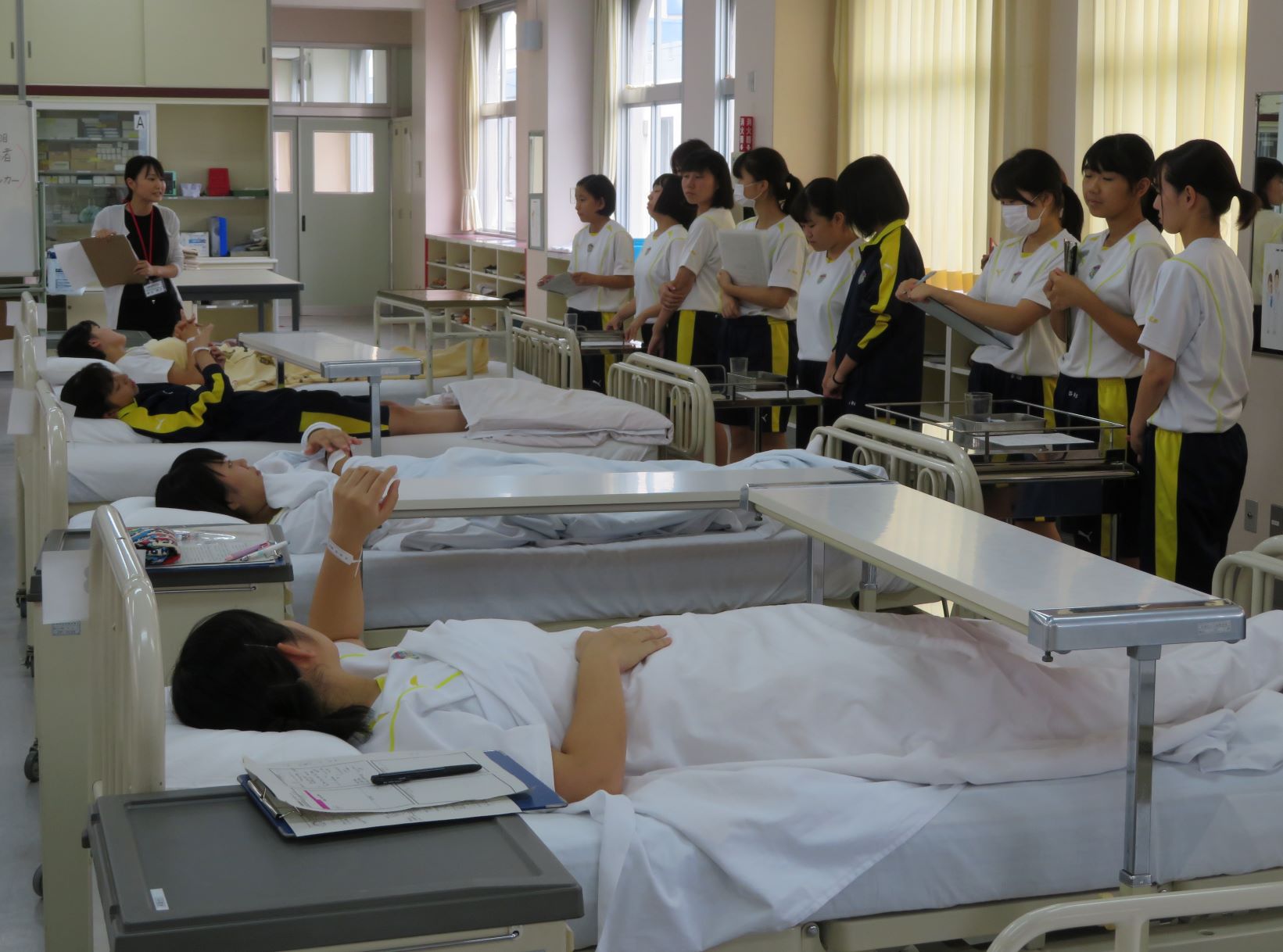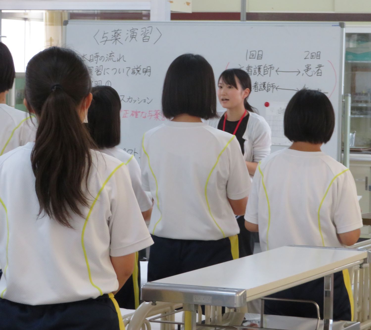 去る10/1(火)6限目、看護学科基礎課程2年7組で本校看護教員福谷理沙先生による「基礎看護」の研究授業が行われました。単元名は「与薬・輸血を安全かつ正確に行う技術」で、看護実習室で行う実践的な授業でした。福谷先生は「より臨床に近い状況を作り出すことで、生徒が安全安楽な看護を提供できることに繋がる」と期待していました。