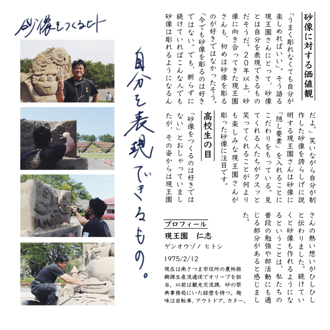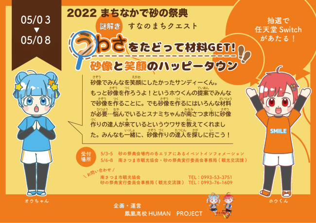 生徒たちは昨年の12月末から砂の祭典までの約4ヶ月の間,自分たちの好きや得意を生かして活動をします。 謎解きの企画や写真展の企画,砂の祭典フリーペーパーの作成など,生徒たちの活動に注目です。