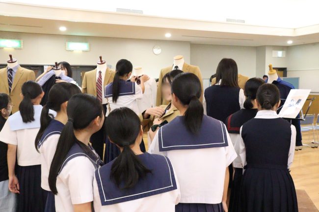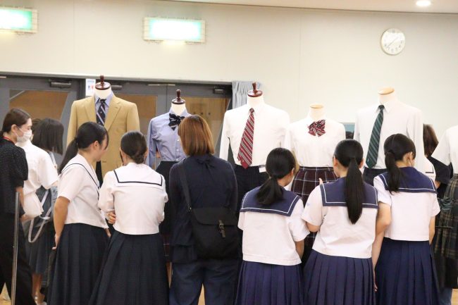 制服展示コーナーでは新しい制服を試着したり、様々なコーディネートを楽しむ中学生や保護者の皆さんの姿も見られました。