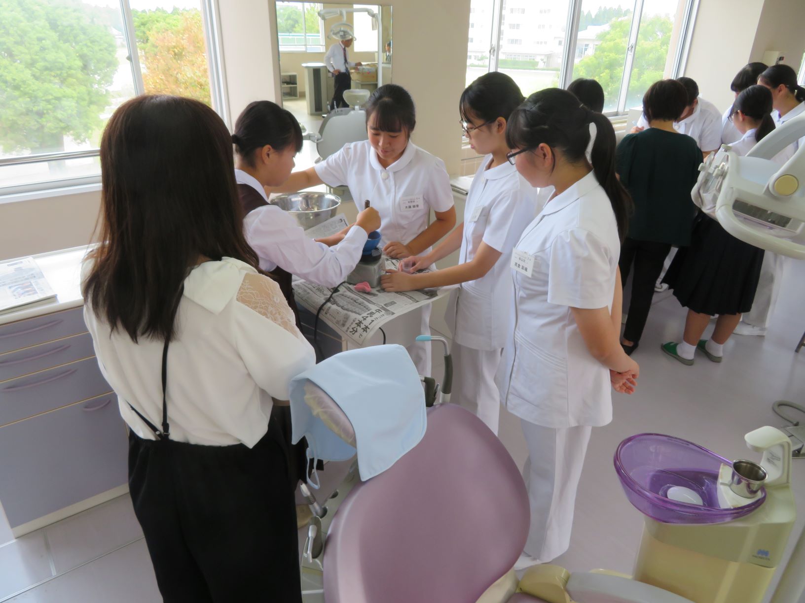 ▲入校式では総合福祉科3年生が手話も交えて司会進行 ▲メディカルシステム科では歯科実習体験