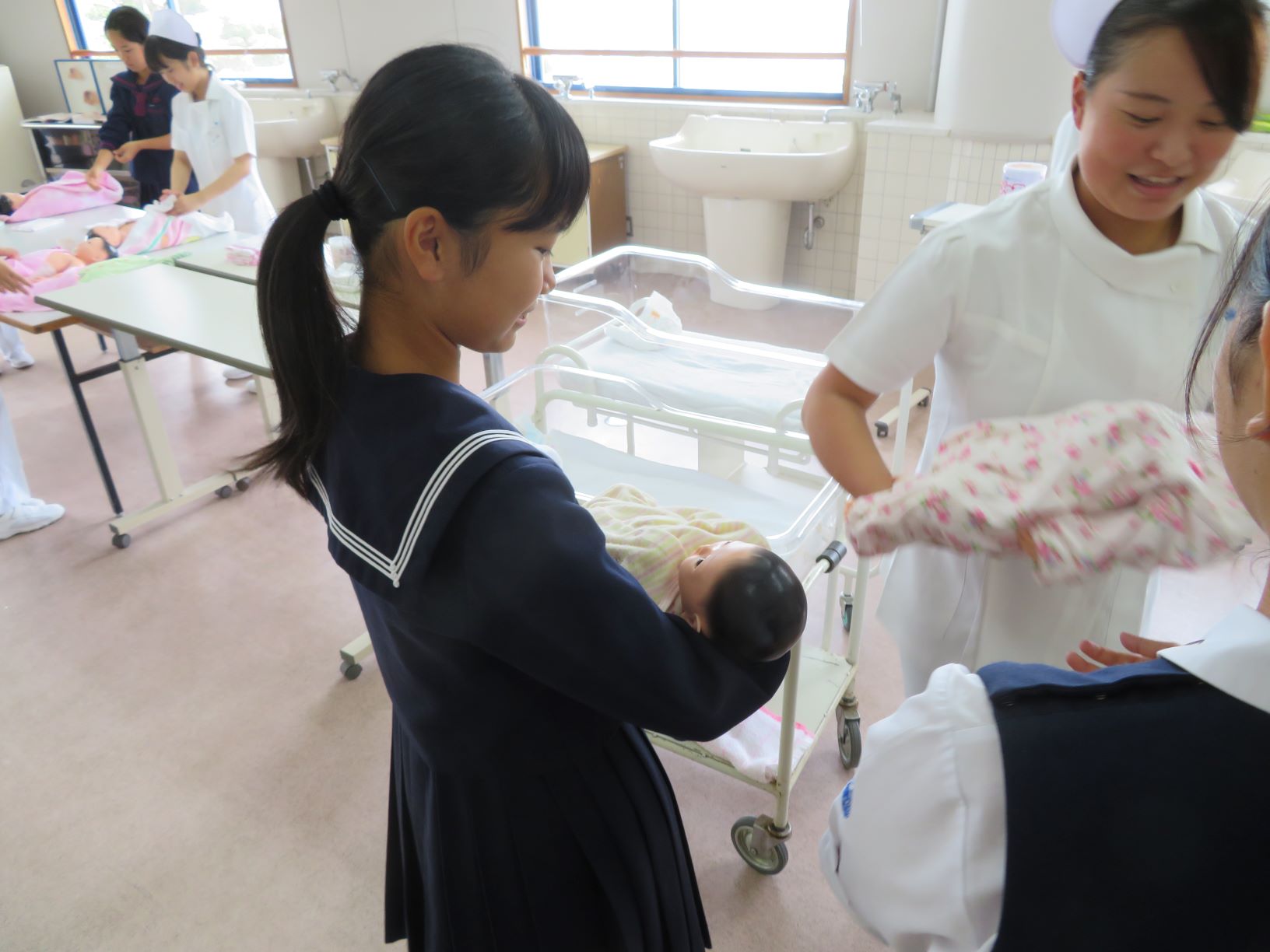 ▲総合福祉科ではハロウィン飾り製作 ▲看護学科では乳児模型で沐浴、おむつ交換なども体験