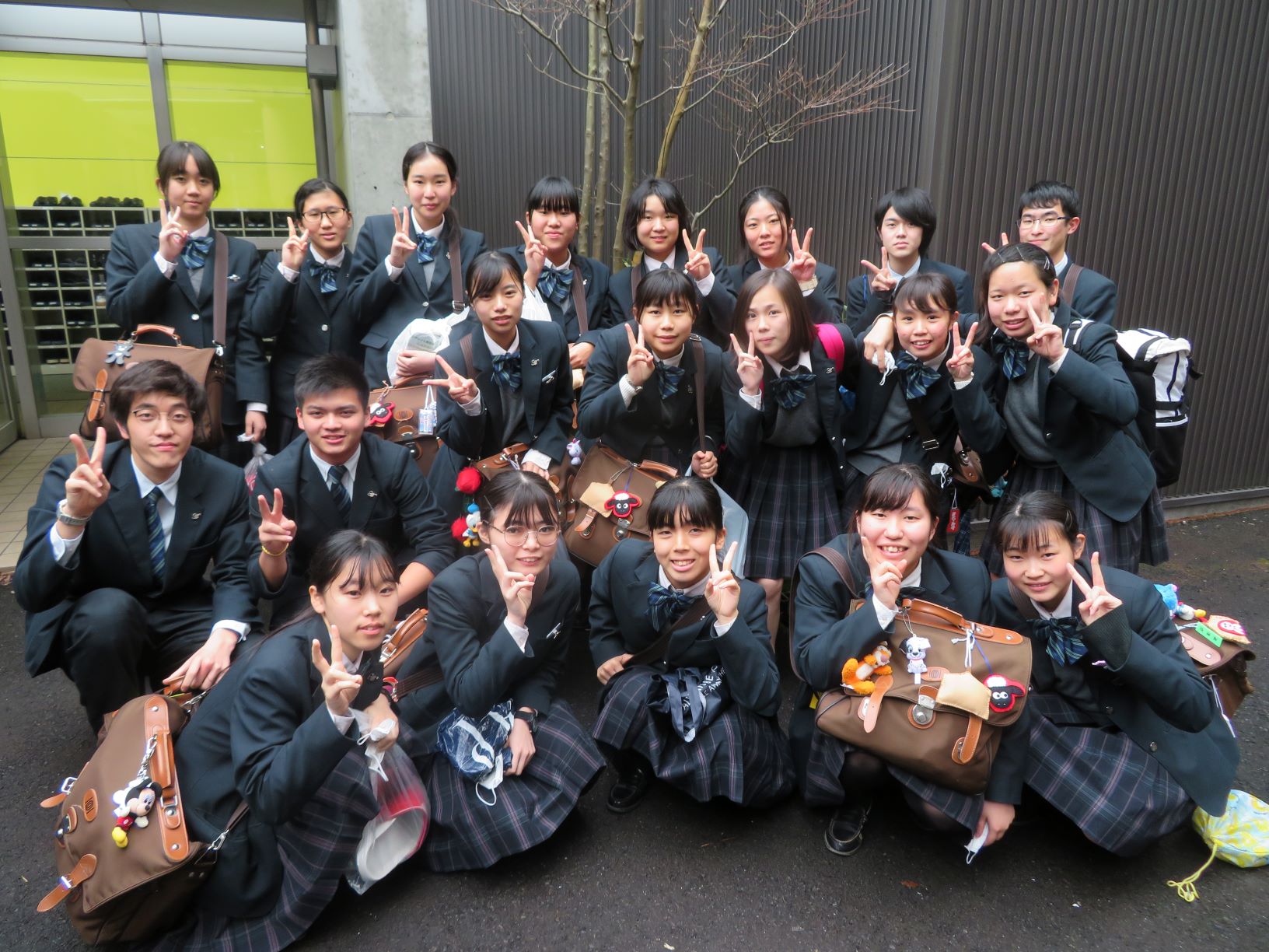 ▲試験終了後の記念撮影は、3月下旬の合格発表を待たずしてVサイン!!