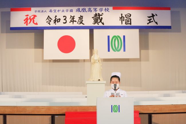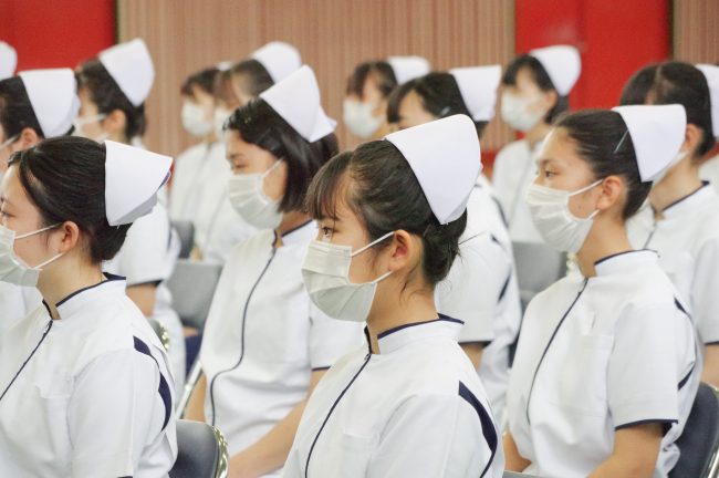 看護学科基礎課程2年生(19期生)はナースキャップを着け、白衣を身にまとい、看護の基礎を習得し臨地実習や更なる専門的な学習に力を注いでいくことを全員で誓いました。