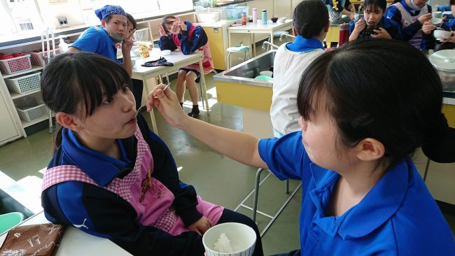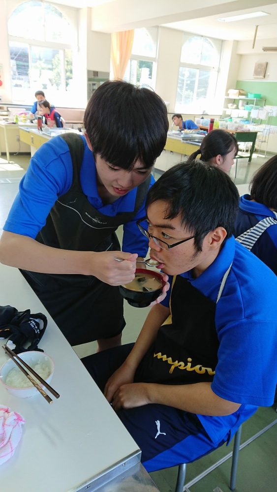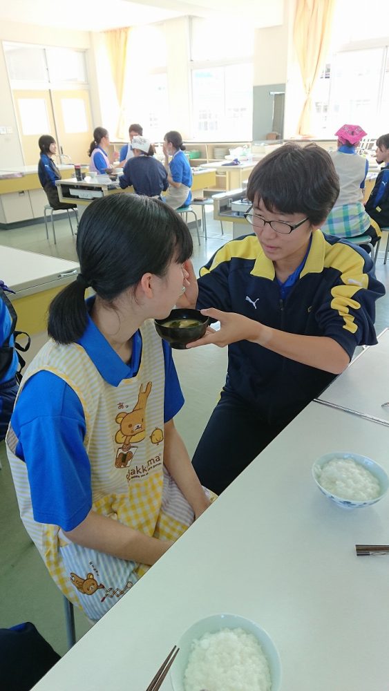 調理後は、実際に利用者の方に行う食事介助をしました。 生徒の中には、おかゆを始めて調理して、始めて食べた生徒もいました。