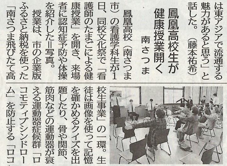 去る11/1(金)本校文化祭で開催した本校看護学科生による「看護師のたまごによる健康授業」が昨日11/10(日)南日本新聞に掲載されました。来る11/17(日)にも南さつま市の「健幸・福祉ふれ愛フェスタ」で開催予定です。(下のチラシ参照)ご来場をお待ちしております。