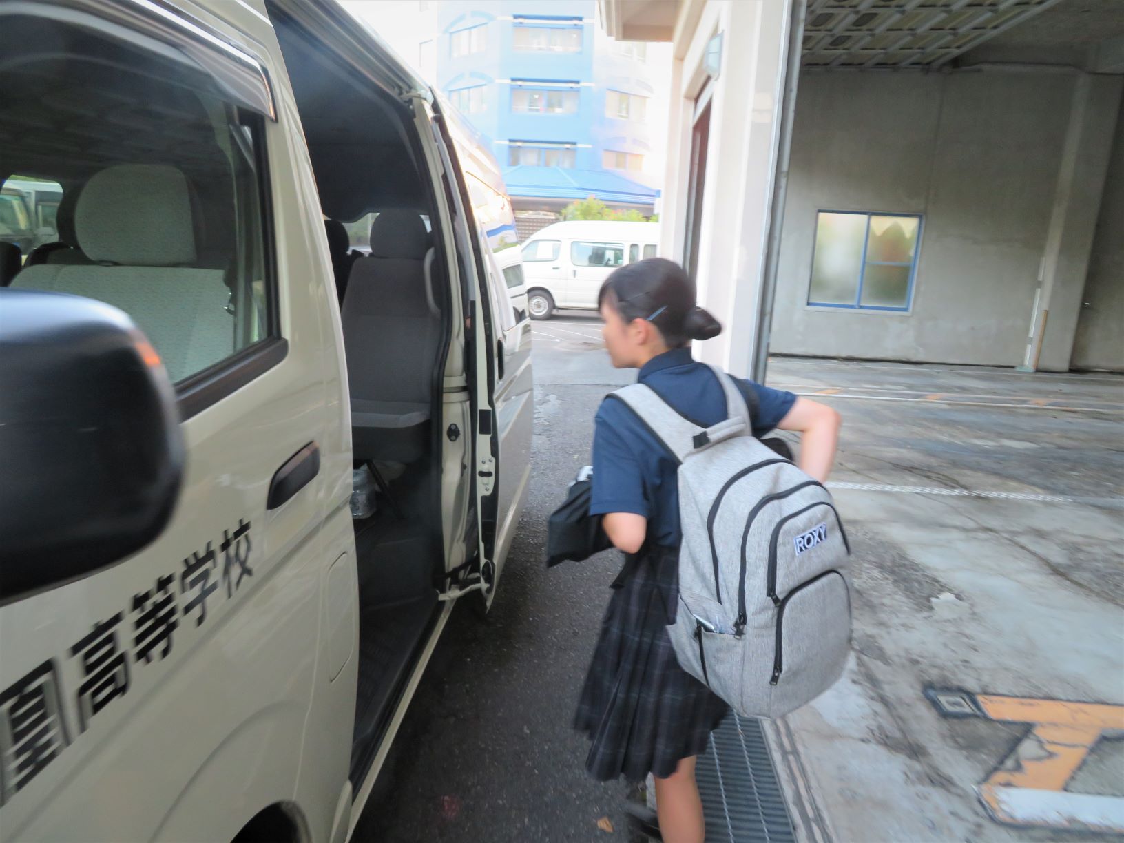 ▲(写真左)出発10分前行動で早朝6:30には送迎バスに乗り込み、鹿児島市の実習施設に向かいます。